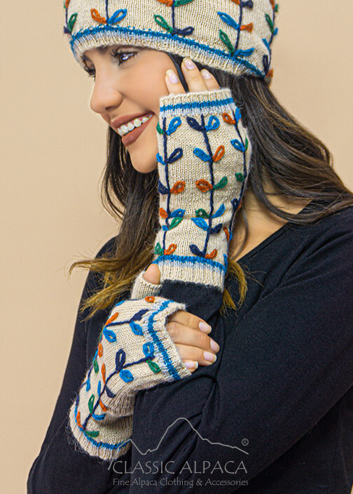 PreviewsEmboroiders hand made gloves with a unique look with have everyone asking where you got these gloves. They come with a matching hat that will keep you warm and cozy on a crisp fall day right through the harsh winter season. Perfect for women using keyboards and mobile devices. Alpaca fiber makes these fingerless gloves soft and warm.